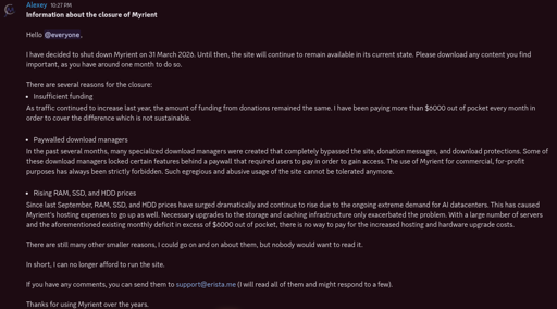 arrow-up1146imageMyrient is shutting down on March 31st, 2026 (best ROM preservation and hosting site with over 390 terabytes)plus-squarelemmy.mlthingsiplay@lemmy.ml · 1 month agomessage-square18linkfedilink