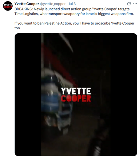 arrow-up189imageNewly launched direct action group "Yvette Cooper" named after the politician who proscribed "Palestine Action" as a terrorist organizationlemmy.worldIndustryStandard@lemmy.worldEnglish · 8 months agomessage-square1linkfedilink
