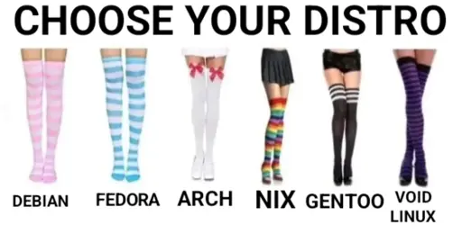 The meme is offering you classy stockings to wear according to your distro choice. Look again - are you happy with the color? Would they complement or contrast your body stylishly? Have fun :)