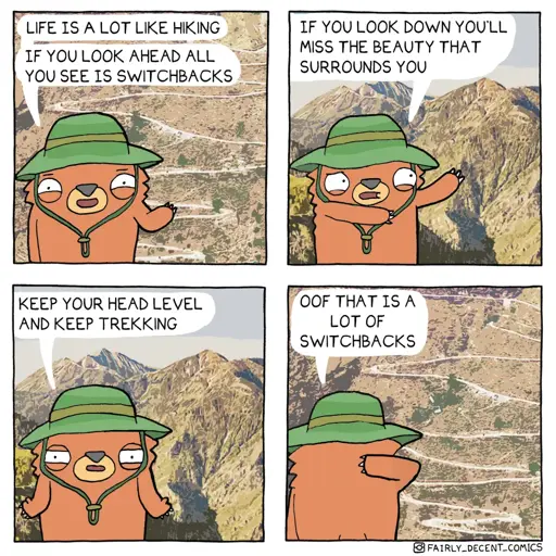But the thing about taking the hike, even with all the switchbacks, is that… there’s a lot of really cool stuff on that hike, no matter which path you start from or which mountain you are climbing. Those amazing things are mostly nestled where your path whips you back around. You won’t experience any of those things if you go straight to the top. And where’s the satisfaction in that?