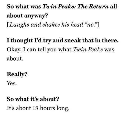 I later learned that Lynch had very little influence over that portion of the story, which made me feel a bit relieved. Every other Lynch piece Ive seen has made me feel something strong in one way or another, so finding out that he didn’t actually miss on s02 kinda made me feel like all was right in the world (or at least in this one tiny corner of it) again, silly as that may sound lol