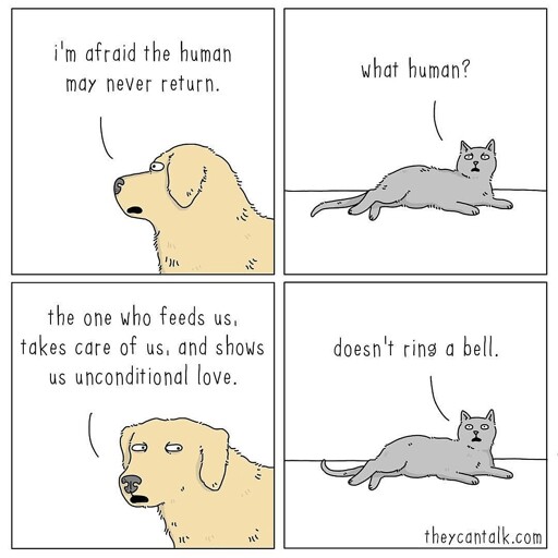 Yeah it’s always so jarring for me. My cat, when I still had her, was the cuddliest, most loyal and loving cat ever. Ran to greet me when I got home and knew when bed time was and would even “yell” at me when I stayed up too late. She even loved belly rubs!