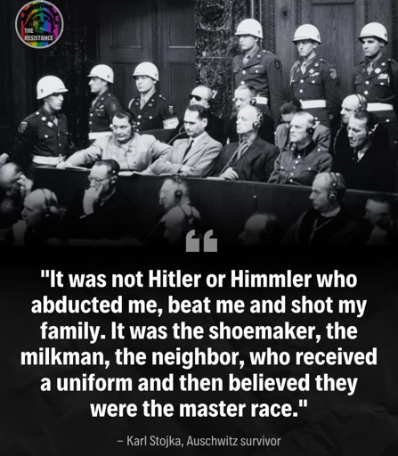 “And people did this, just like you, you and me. These people did not come from another planet. […] They were human beings, just like us. And it was not Hitler who arrested me, not Goering, not Goebbels. The grocer, the janitor, the tailor, the shoemaker, the baker, they suddenly got a uniform, a swastika armband, and there they were, the master race…”