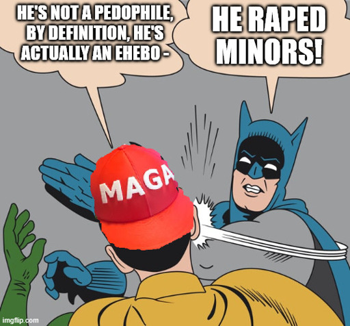 After the normalisation of racism, sexism, homophobia, transphobia, white-supremacy, maga is now explaining us how raping kids is not actually pedophilia. Or if it is it’s because those kids where beging for it. And if they didn’t they just deserved it and the age of consent is a woke concept anyway.