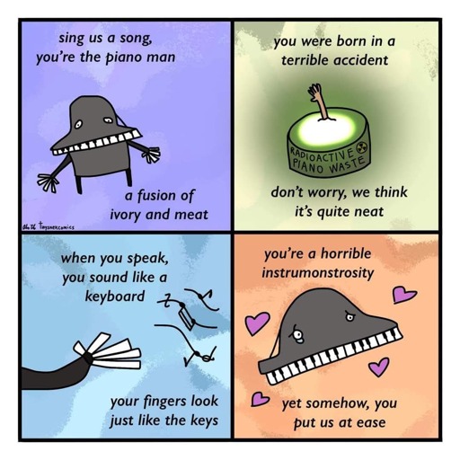 I don’t know if this is the place for this, but god damn is the original Billy Joel song cringeworthy. “Making love to his tonic and gin”, something absolutely nobody ever says (it’s “gin and tonic”). “Talking to Davy who’s still in the navy” is another example of mangling shit to fit the rhyme scheme. And it’s all just a song about how awesome and better-than-this he, Billy Joel, is (“man, what are you doin’ here?”).