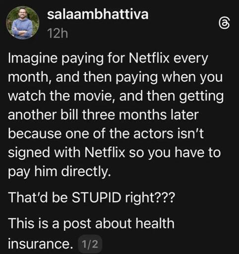 The problem with US citizens and their bullshit world views are…it takes other countries 6+ months for surgeries (which I know isn’t true), but most, well most Republicans, in the US think you’ll be waiting 6 months for life saving surgeries and you die waiting for them overseas.