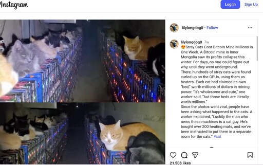 This looks AI. Inconsistent focus, scale of cats is different, lights on “rig” are inconsistent, where’s all the LAN and power cables? Who builds a bitcoin mine in a weird tunnel?