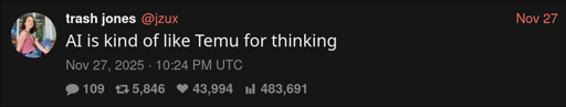 orhtej2@eviltoast.org to Microblog Memes@lemmy.worldEnglish · 14 days agoAI is like Temu for thinkinglemmy-api.eviltoast.orgimagemessage-square19linkfedilinkarrow-up1626file-text