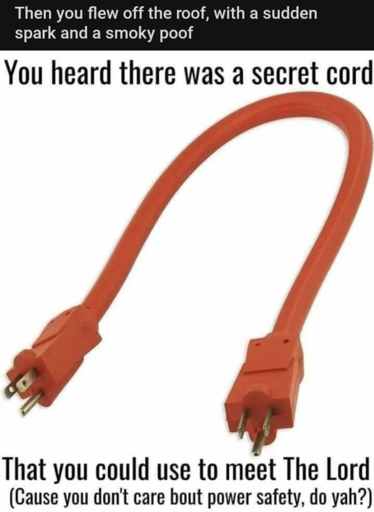 But your generator should plug into some place before the main panel, and it’s easy to put the right connector on that one place destined to it and where you shouldn’t plug anything else. So it’s people not prepared to use a generator, that want to use one anyway, and that have to be sure to disconnect it before the power comes back on or they will find the main use-case for the cable (AKA, the one on the meme).