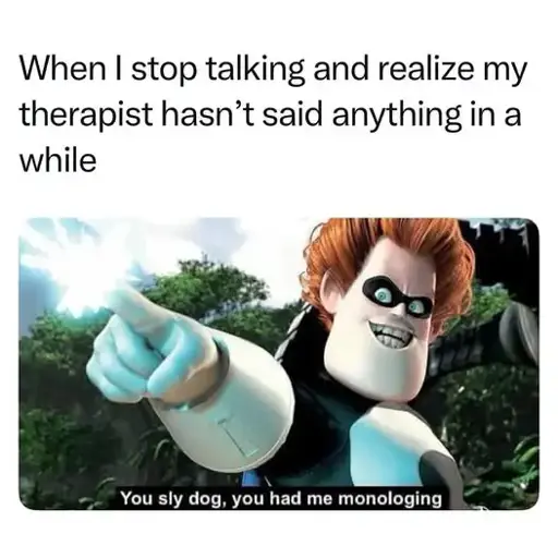 My last therapist had me down for 30 minutes a month, spent the first 10 minutes of every session talking about the session plan, then 15 minutes talking about his personal approach to therapy, then asked me about 2 - 3 questions, then started talking about how whatever I replied with fits right in with his upcoming book’s theme as well as his youtube channel.