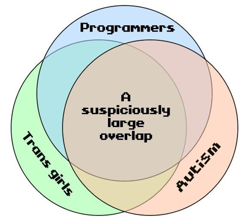 Transcript: Venn diagram showing suspiciously large overlap between Trans girls, Programmers, and Autism.