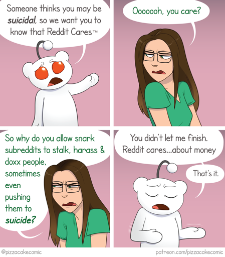 It made me laugh when it was in response to someone getting mad at me after arguing, but occasionally I’d make a highly upvoted comment that was related to being trans or gay and then get them, and that pissed me off. It’s not possible to prove that’s what happened without access to server logs of course, but I for sure wasn’t talking about being depressed or suicidal or anything like that on Reddit, and it was suspicious at minimum.