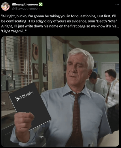 Light: “Uh, yeah…” absentmindedly rips piece of the Death Note out “Uh, here you go…”