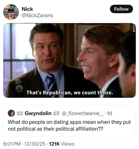 Not on any dating apps, but people I know who describe themselves as non-political are just so sick of it they can’t bear to talk about it anymore, which I totally get. Especially since any good discussion always ends up ruined by someone who’s very “political” but only gets their news from Facebook or something worse.