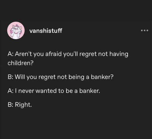 That’s the entire point, is to demonstrate to them their own fallacious reasoning yet all you’ve done is come across like a dumb dumb that thinks having kids is somehow equivalent to becoming a banker