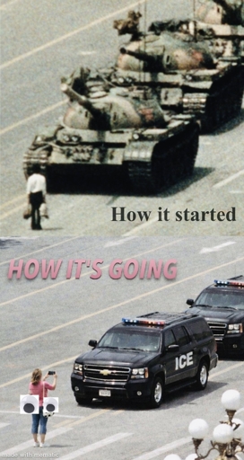 This would have been quite poignant and an historic image, had some child not copy pasted pictures of cartoon eyes onto that brave woman’s arse, making a mockery of their fight against fascism, presumably to discredit her and support the US Gestapo.