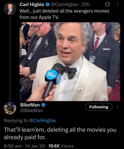 In the same vein, it wasnt that long ago that here on Lemmy someone was giving me shit because I won’t throw my Harry Potter movies away. Like, it’s not gonna take the money back from Rowling if I do that. 🤷♂️