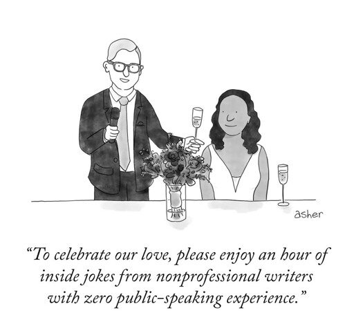 When I was the best man, I worked on my speech for like a month, kept it to like three minutes, had nothing to drink beforehand, and shortened it on the fly to match the maid of honor’s.