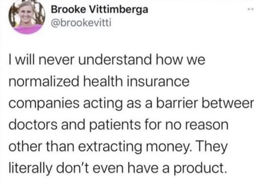 The old arguments were “Look how long they (the socialists) wait to get appointments and get seen!” Yep, we’re there now. I have insurance, I still pay a bunch, and seeing specialists is a luxury at this point. If I have an issue, I don’t even consider calling specialists, because I know it’s weeks til I can get in.