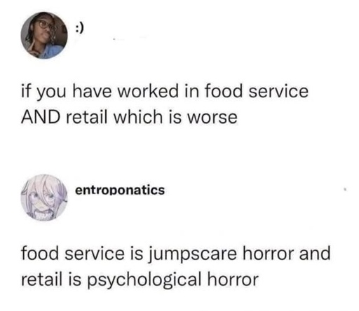 Right so in the jumpscare genre you use psychological trick, and in the psych horror genre you use jumpscares on shoplifters and bad customers who can wait an extra minute for their help.