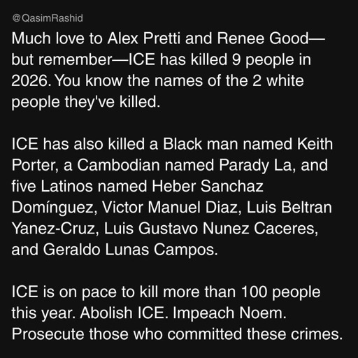 Sure I agree but can we we just list all the names of the people affected without the cringe “You only know about the white ones” bait for disengagement? We want to capture as many as people as possible into this movement against fascism, it’s just fucking not the time to finger-wag and shame and even imply that we’re not all on the same fucking side here. If you can’t see how this pushes away average Americans you either don’t care or don’t understand how human emotional intelligence works.