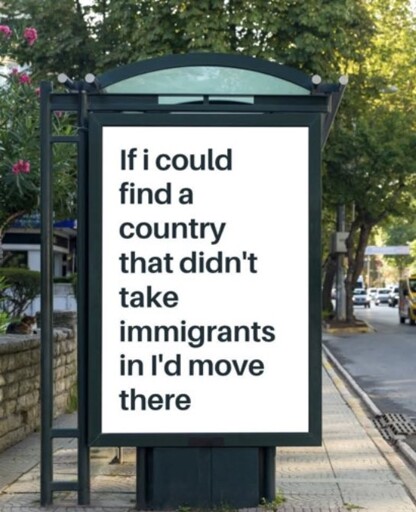 Transcript: Image of sign reading, “If I could find a country that didn’t take immigrants in I’d move there”