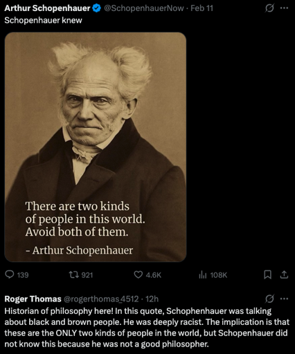 Schopenhauer attributed civilizational primacy to the northern “white races” due to their sensitivity and creativity (except for the ancient Egyptians and Hindus, whom he saw as equal):