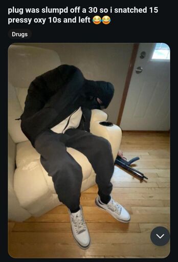 “My [drug dealer] is [feeling the effects] of a [Percocet 30mg] so I stole a quantity of fifteen [hand pressed 10mg oxycodone tablets] and absconded with my loot.”
