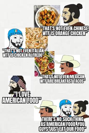 I mean Chinese and Mexican people have been in America for almost two centuries. I’m usually the first one to shit on Americans, but at this point Chinese-American stuff and Tex-Mex are theirs.