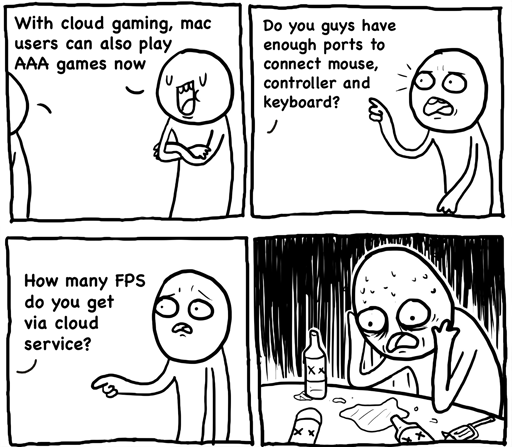 Dont get me wrong i dont like Apple, Geforce Now or cloud anything either. But if a nongamer is able to subscribe to a service for a month or two to play that one game on his macbook thats not a bad thing? Like good for him.