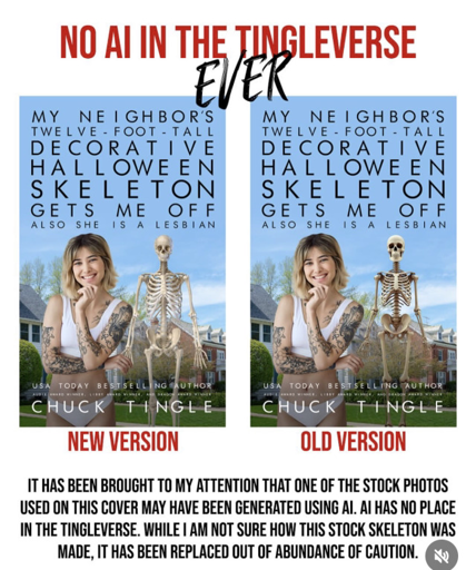 I am thoroughly confused about what is happening here, but this appeals to several of my interests. Namely 12 foot tall decorative skeletons, hating on AI, and of course lesbians.