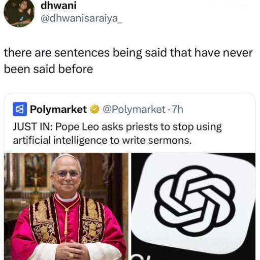So whenever they give a speech, it’s treated as a speech from God. Clearly, AI has nothing to do with God if one exists, which means anyone attending such a sermon is being blatantly scammed. The Pope shouldn’t ‘ask’ anyone to stop using AI. He should immediately remove all of them from clerical service for defrauding people on the Church’s behalf.