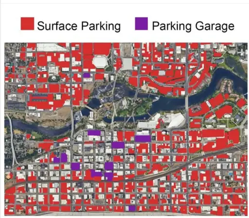 arrow-up1555imageDowntown Spokane, Washington. The red areas represent surface parking lots, while the purple ones indicate parking garagessh.itjust.worksValnao@sh.itjust.works to Fuck Cars@lemmy.worldEnglish · 1 month agomessage-square77linkfedilink