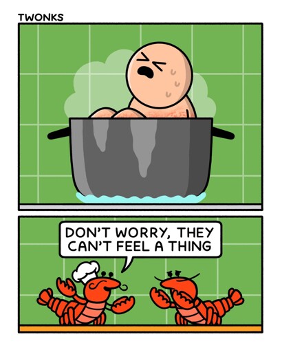 When I was a kid, I watched a TV show with one of Australia’s early ‘celebrity’ chefs, Bernard King. He had a live lobster in front of him, which he then proceeded to cut the tail from. The lobster made audible ‘squeeee!’ noises, and tried to move away. He just laughed and said it couldn’t feel anything.