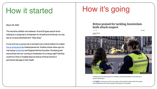 This meme is trying to say that a British tourist seemingly prevented a crazy knife wielding attacker in Amsterdam which directly contradicted the scapegoating campaign.