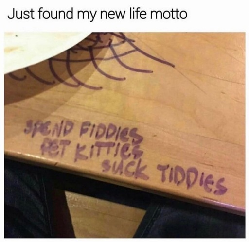 minus-squarejeffep@lemmy.worldlinkfedilinkarrow-up9·3 days agoWhy not spend kitties, pet tiddies, suck fiddies?