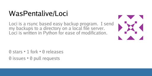 Loci is a python script that can backup a directory to a server using rsync - It keeps track of the backups that have been done. Multiple backups may be kept. Rsync is used to handle the backups so only the needfull is copied and single files can be recovered from the backup if needed. loci -b tag : Backup under the tag given (I used days of the week)