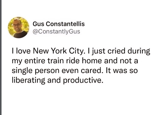 You’re not expected to put on some presentable front just to exist outside, you get people in pajamas walking their dog through a midtown block full of people in suits. Its nice that kind of everyone is just accepted and allowed to just live in peace no matter how shitty their day is going.