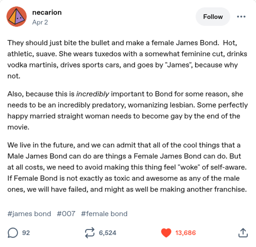 VetOfTheSeas@discuss.online to Microblog Memes@lemmy.worldEnglish · 17 hours agoGive me toxic womanizing female Bonddiscuss.onlineimagemessage-square122linkfedilinkarrow-up1746