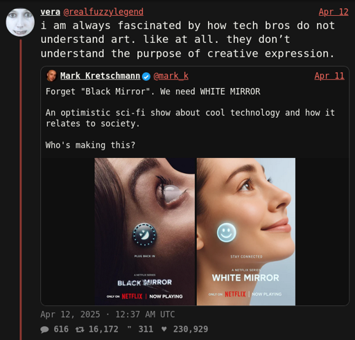 The QAA podcast recently had an episode on AI generated images and right wing movements and they said something that really stuck with me- AI “art” is so popular among right wingers and barely literate tech bros because it is truly art the way they see all art, images with only surface level literal meaning and no subtext, context, or anything actually thought provoking. The dumbest thing about this is that there are several Black Mirror episodes that are ultimately hopeful or value-neutral about the effects of technology on the future- San Bernardino and Striking Vipers come to mind. Then again, both of those are about how sexuality intersects with transhumanism, which right wingers generally see as bad things so maybe they see those as dystopian episodes as well.