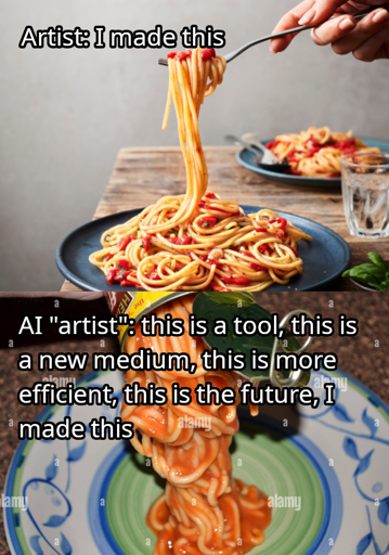 Interestingly I think the top “I made this” looks AI generated and the bottom image depiction of AI slop was an actual photo from alamy.