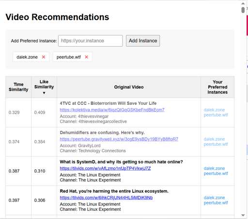 - 404 check for generated instance links (so you don’t get stuck clicking into dead videos—you’ll know which instance hosts the video).