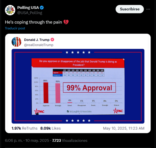 Bad data representation, but not outright lying here. Where the lie comes in is that you had to be a Trump supporter to even vote. It’s based on CPAC attenders, aka politically active MAGAs. The 1% that disagree he’s doing a great job probably want him to be doing more of his bs.