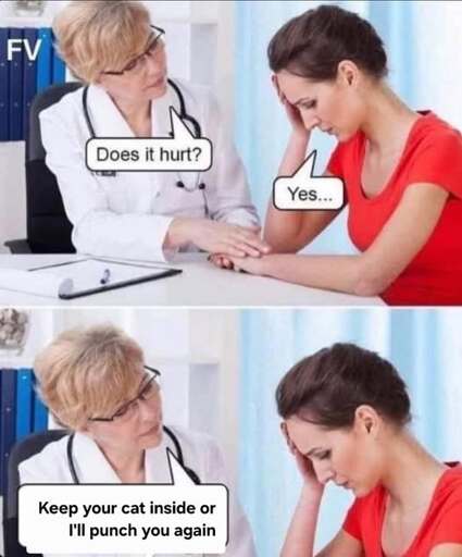 [alt text: a two panel comic. In the first panel, a doctor is talking to a patient, and the patient is holding her head. The doctor is saying, “Does it hurt?”, and the woman is replying, “Yes…”. In the second panel, the doctor is replying, “Keep your cat inside or I’ll punch you again”. ]