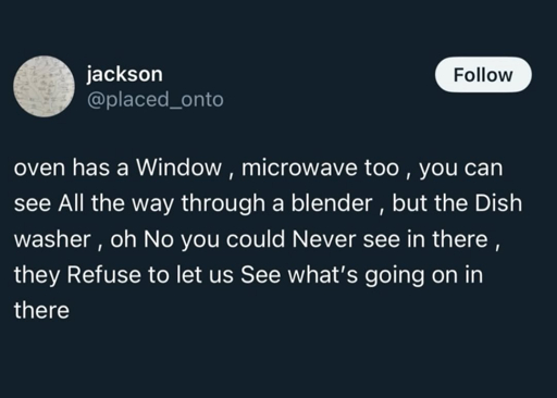 On the one hand I get that people with large dishwashers don’t want to learn how many times the same goopy water is recycled to splash over the things they put in their mouths, but it’s kinda mesmerizing, if I’m being honest.