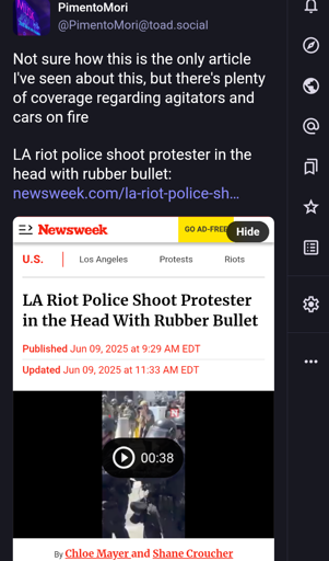 Found it by searching the headline: https://www.newsweek.com/la-riot-police-shoot-protester-head-rubber-bullet-2082794