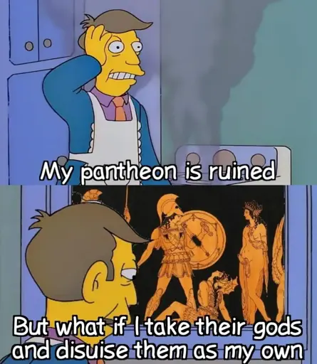 If you want to go even deeper, look into how much the Greeks took from the Egyptians and the Anatolian “Hittites”. It turns out that stealing gods and stories was (and is) a common theme amongst people groups. The Greek goddess Aphrodite was probably (emphasis on probably) a loan and reinterpretation of Ishtar/Asherah/Innana. Look up Serapis as well. Fascinating examples of syncretism by the Greeks.