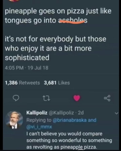arrow-up1550imageI'd never let my tongue touch a pineapplelemmy.dbzer0.comSnokenKeekaGuard@lemmy.dbzer0.com to Lemmy Shitpost@lemmy.world · 5 months agomessage-square42linkfedilink