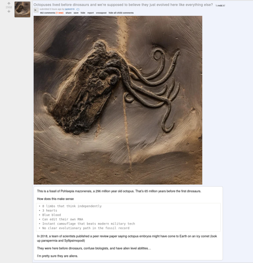 If you feel like having some of your brain cells commit suicide you can read the comments here - https://www.reddit.com/r/conspiracy/comments/1m6p3p6/octopuses_lived_before_dinosaurs_and_were/