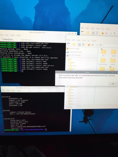 I was trying to setup Samba and get a directory shared from the external drive I have connected to my Pi. Got frustrated as I couldn’t make a connection from my laptop or PC and decided to yank the drive and plug it direct to the PC, but getting this unknown error now mounting the drive anywhere. I was messing around with the samba conf file replacing the number/letter string back to the drive name–i had gotten an error previously, maybe due to the spaces, so used this string instead. I think I had started looking into mounting the drive but can’t find any terminal commands I ran in that respect, and I got interrupted so can’t remember what I was doing. I tried putting the path back to the string but no luck. Can someone point me in the right direction?